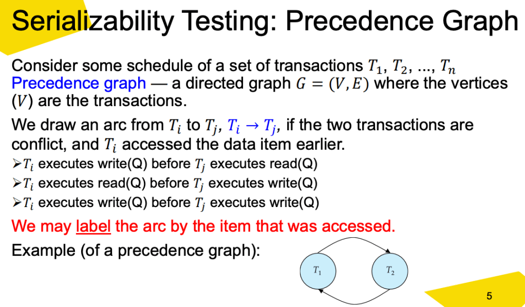 Precedence Graph(前置图)是一种用来表示事务之间依赖关系的有向图,通常用于分析数据库事务调度的正确性,特别是在并发控制和事务隔离的上下文中。它通过图中的节点和边来表示事务之间的关系,帮助我们判断事务调度是否是可串行化的。