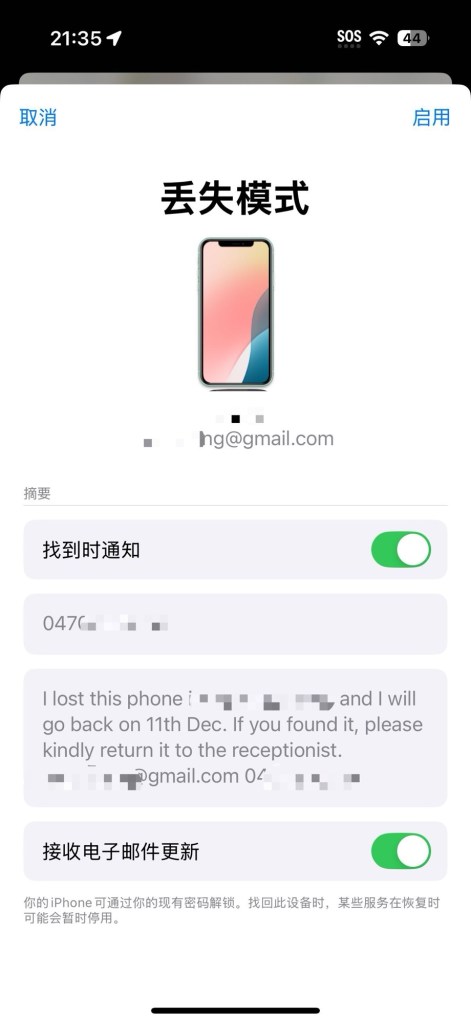 于是我搜索这时候应该怎么处理,第一步是要开启了手机的丢失模式。最坏的情况是,电话卡被盗用,通过刷机能破解屏幕开锁密码,然后通过电话号码加验证码可以登录很多应用软件。开启丢失模式可以锁定设备,并显示一条消息在屏幕上,同时禁止支付功能。可以说,丢失模式在这刻起了至关重要的作用,也是我心态还在线的原因。
